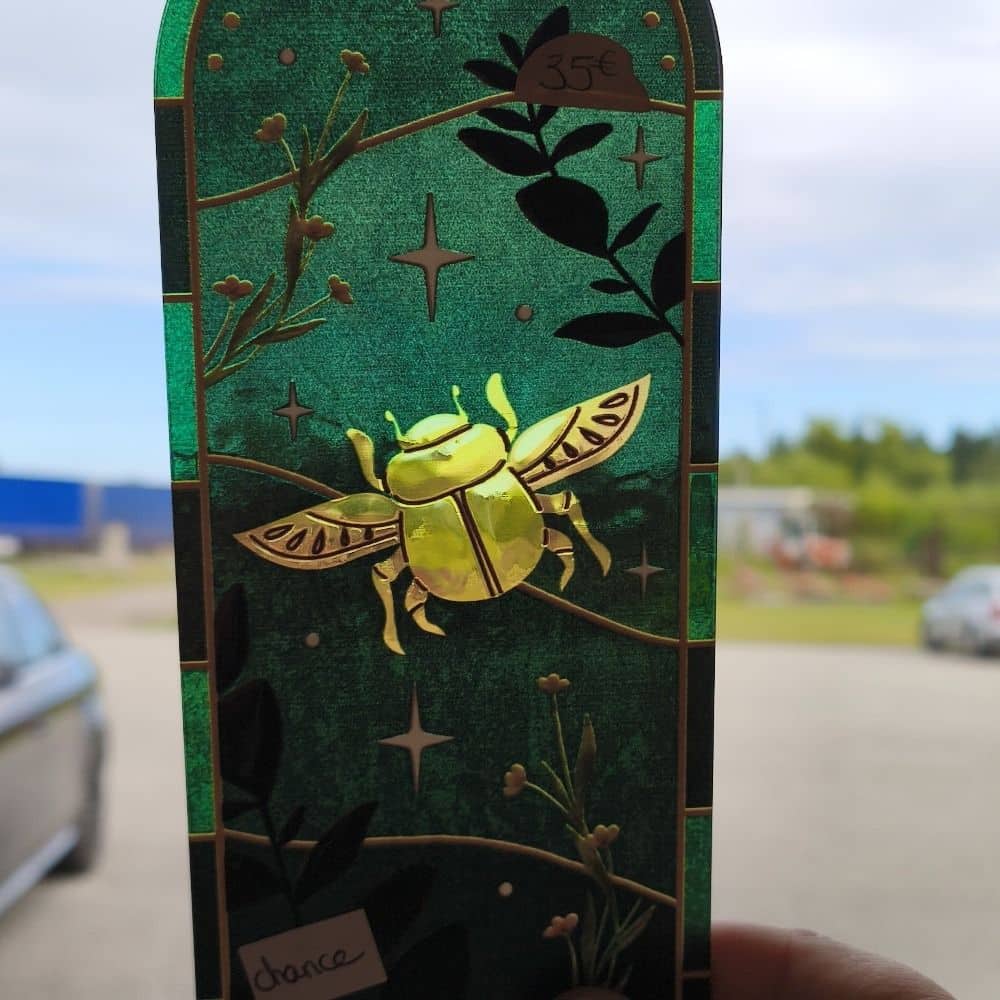 Le scarabée symbole de chance et de prospérité, brille dans ce vitrail posé sur un socle en bois. Placez une bougie devant pour activer une lumière qui attire la chance et la fortune dans votre vie. Ce vitrail est un véritable autel de prospérité, dont l’énergie vous aide à manifester le succès et l’abondance. Le socle en bois renforce cette énergie positive, apportant un ancrage solide et une stabilité financière et spirituelle à votre quotidien.