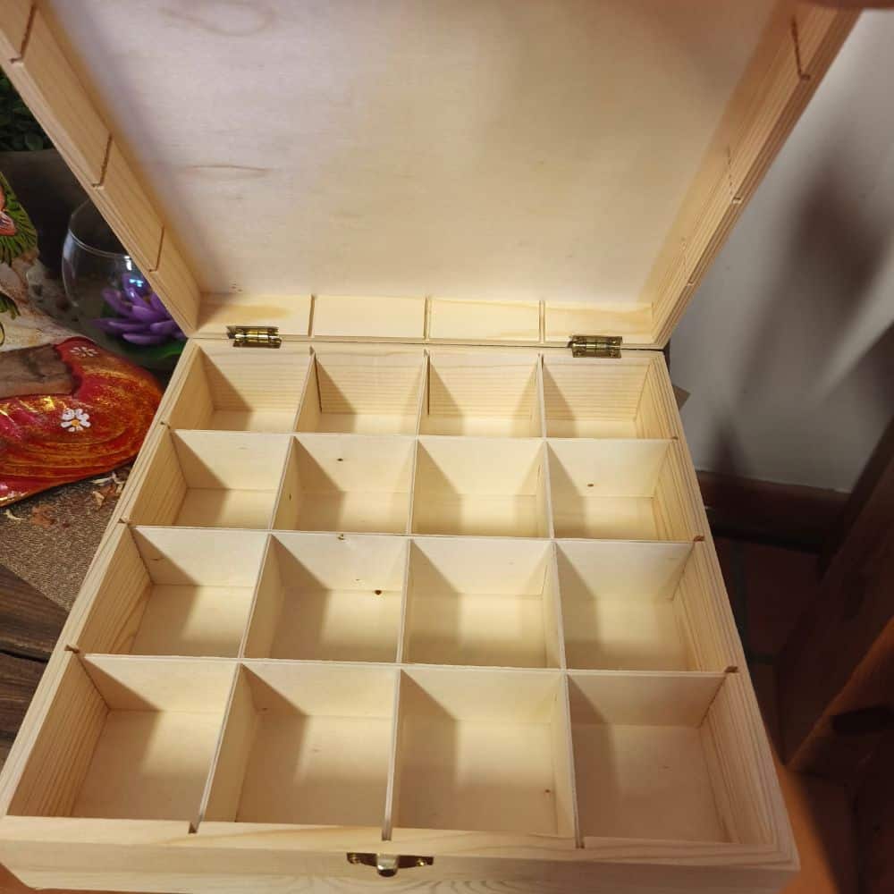 Boîte à compartiments en bois pour stocker les pierres et leurs petites descriptions afin de mieux choisir celle qu’il nous faut quand il faut !