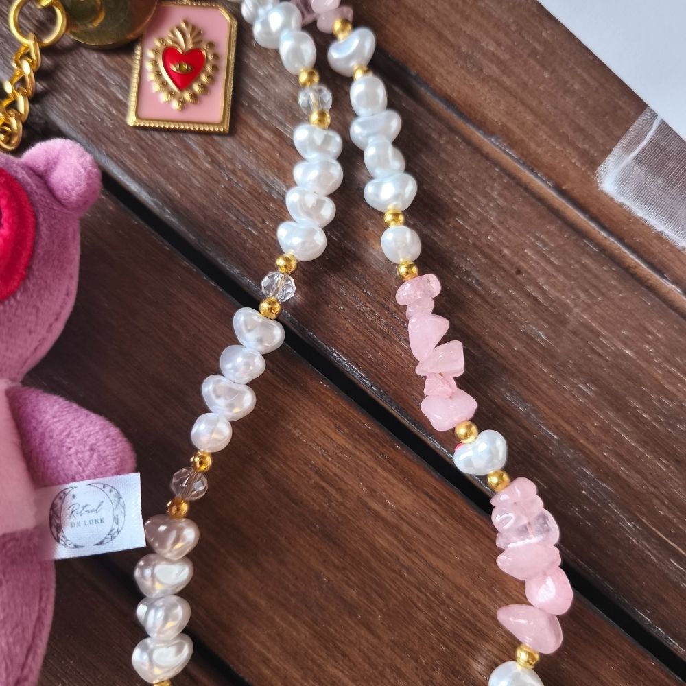 -un fil de quartz rose et de perle pour l’amour de soi , le réconfort, la sécurité