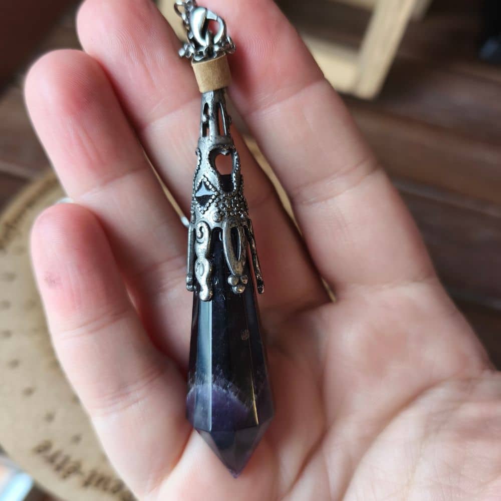 Pendule pointe en pierre naturelle d’améthyste et support en métal argenté vieilli. Dimensions 8 cm. Poids : env 24 g. Chaîne en métal argenté vieilli et pierre d’améthyste. Longueur de la chaîne : 18 cm. 1 pochon en coton naturel.